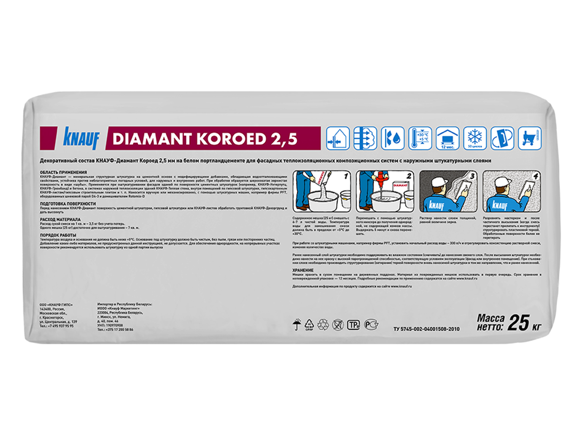 Цементная декоративная штукатурка Knauf Diamant «Короед» — готовая к применению сухая смесь на основе портландцемента с добавлением полимерных компонентов и мраморной крошки фракцией 2,5 мм. Предназначена для создания фактурного защитно-декоративного покрытия на фасадах и во влажных помещениях внутри зданий.